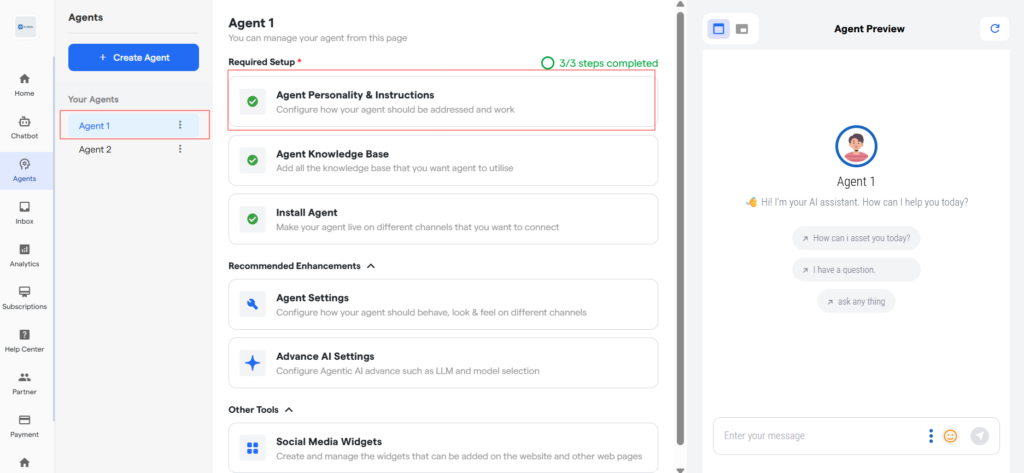 4. You will arrive at the Agent Personality and Instructions section. Navigate to Prompt to edit or add instructions for your AI Agent.
