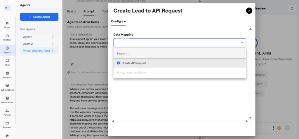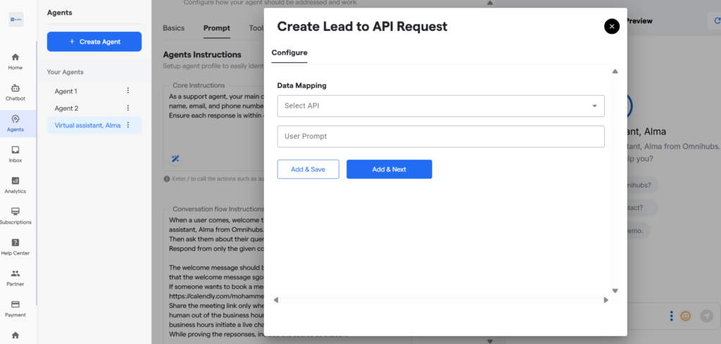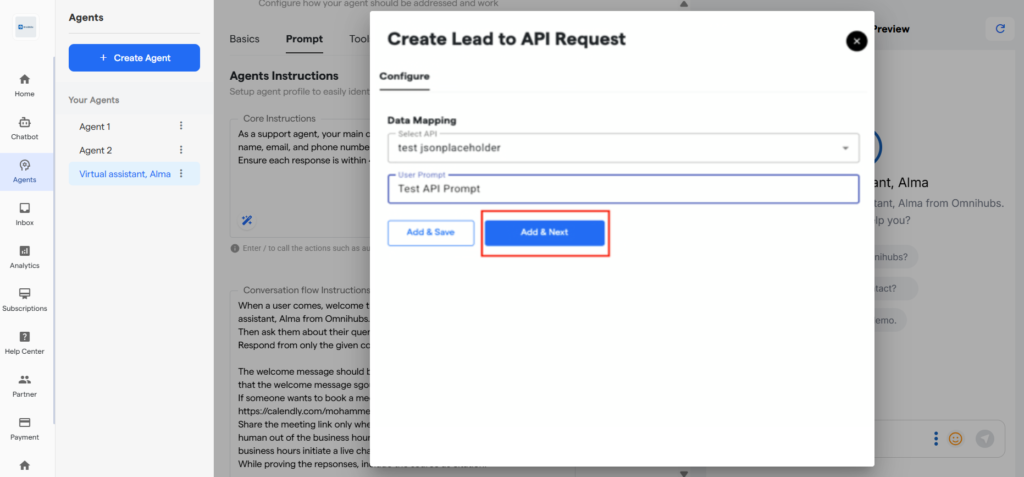 10. Enter the API Prompt, which defines how the Agent should interact with the API.