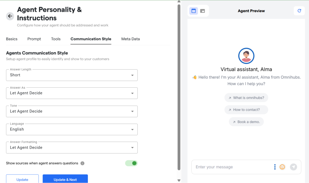 The Communication Style section lets you control how your AI Agent communicates with users. It defines the tone, structure, language, and presentation of the agent’s responses—ensuring conversations reflect your brand and user expectations.