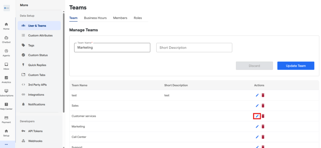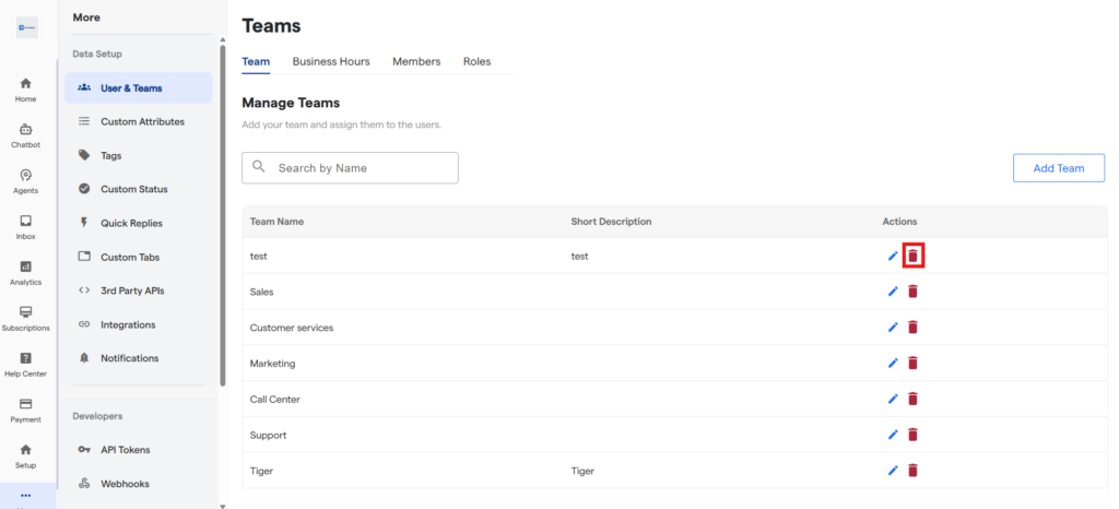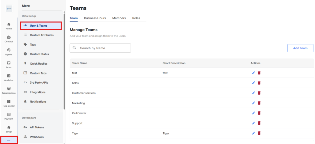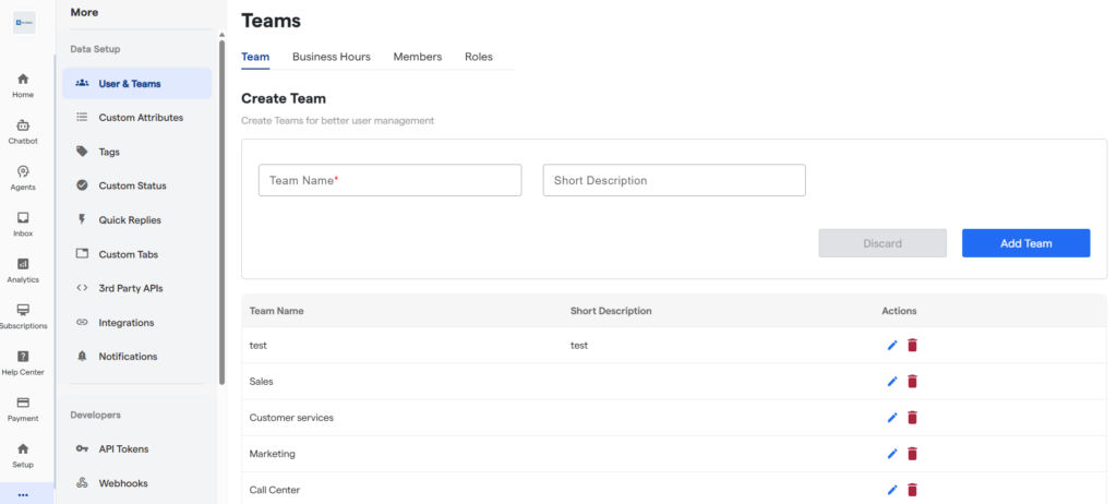 By creating teams, you can organize agents based on departments (like Sales, Support, or Marketing), assign chats efficiently, and maintain structured internal collaboration.