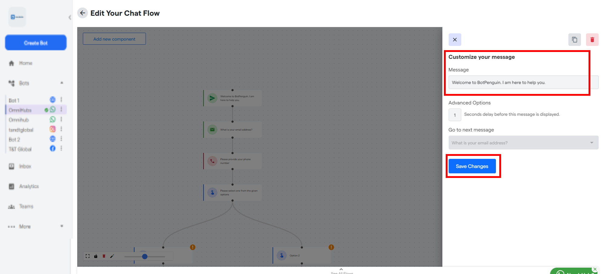 - 3.4 Now, you can personalize the message and the data to be shared. You can, for example, customize the message and URL link to be shared by clicking the component ‘Please contact us at URL’. From the ‘Advanced Options’, you can even change the time delay after which your message appears on the chat flow. Save the changes.