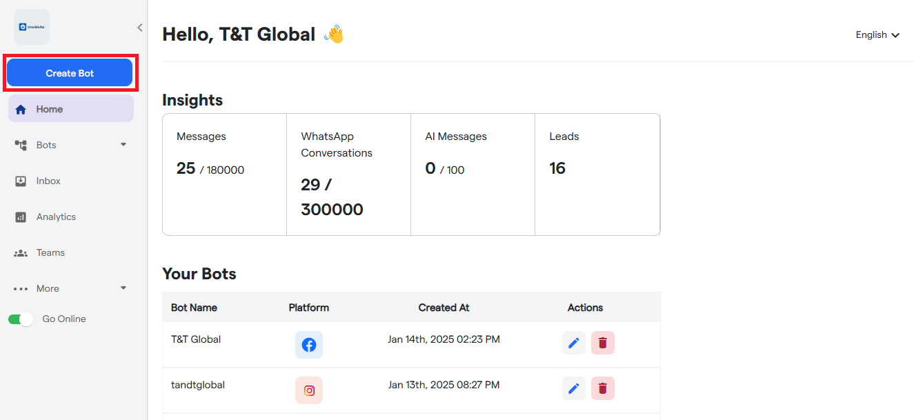 - Login to your Omnihubs Portal and Click the "Create Bot" button on the top right.