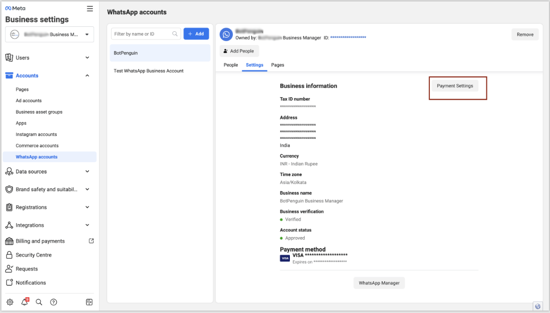 In the "Meta Business Manager," locate and click on the "Payment Setting" button for your WhatsApp Account.