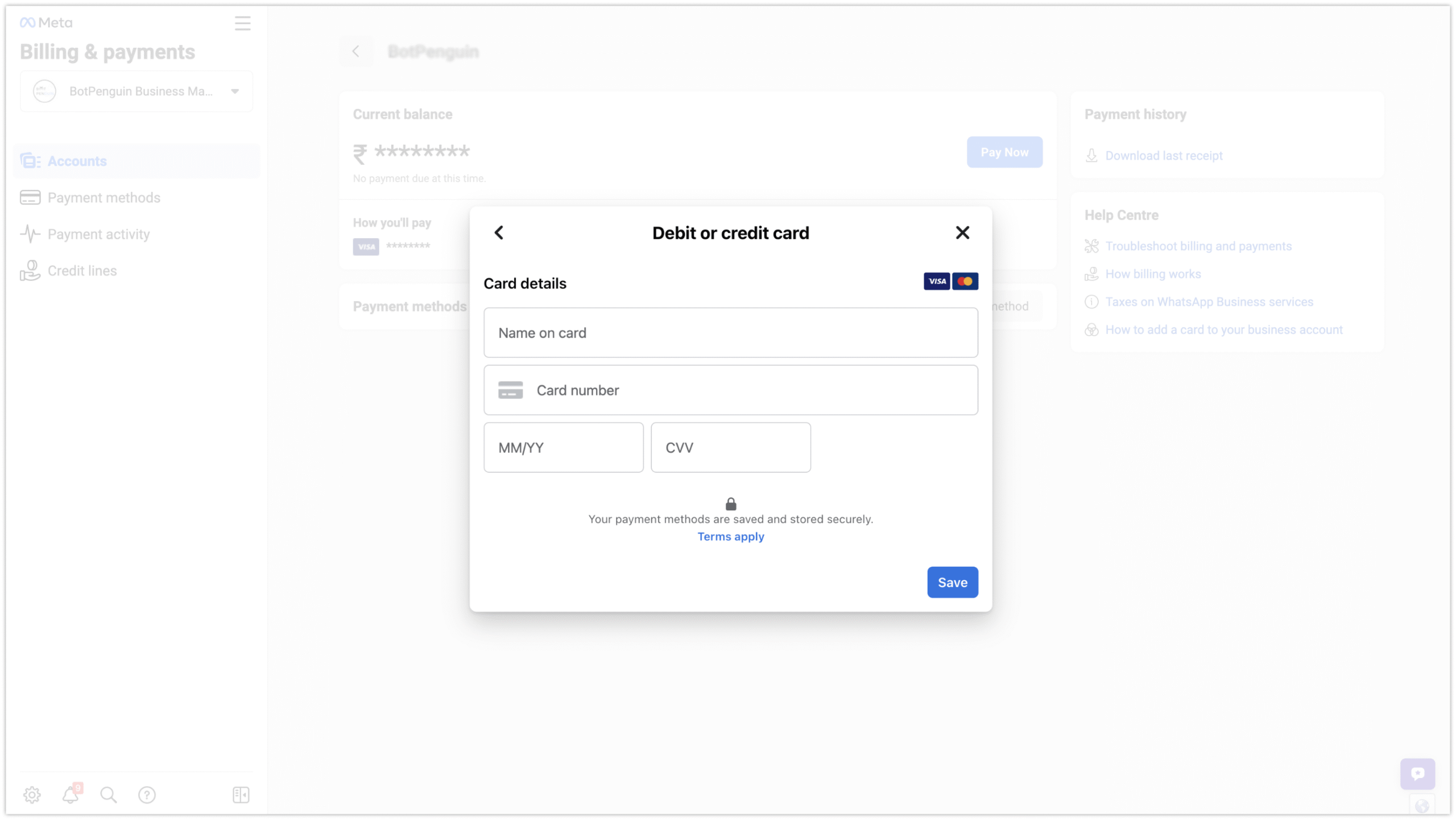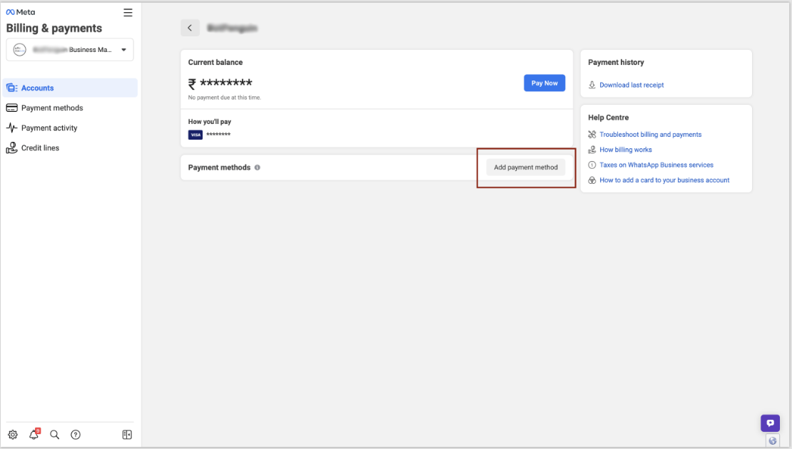 In the Business Manager, update the payment method for your WhatsApp Business Cloud API account to enable seamless transaction processing.